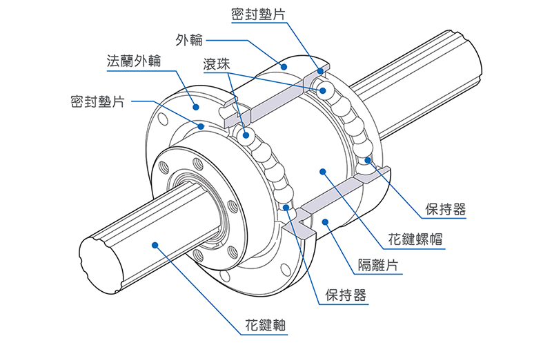 旋转型花键轴外圈上设有三条凸肩突出部分,并且排列了两条(总共六条)滚珠分别从左右方将其夹住,可自然地施加预压。花键螺帽外径上设置带接触角的滚珠滚动面构成支撑轴承,滚珠列通过内部特殊树脂保持器进行循环运动,所以即使将花键轴抽出,滚珠也不会脱落且支撑轴承带有专用密封垫片,可防止异物流入。
